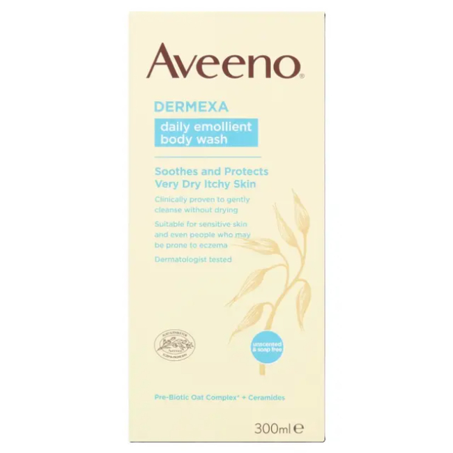 Aveeno Dermexa Emollient Body Wash is a gentle cleansing product designed to relieve very dry, itchy, and sensitive skin, including skin prone to eczema. It helps to cleanse without stripping moisture, leaving the skin feeling soothed, hydrated, and comfortable. The body wash formulation contains a soothing oat complex and ceramides, which work together to support the skin’s natural barrier, retain moisture, and reduce irritation. It is soap-free, unscented, and formulated for high tolerance, making it suitable for sensitive and reactive skin types. The liquid wash creates a mild lather that rinses easily, allowing for gentle daily cleansing without drying the skin. Suitable for adults and children over 3 years, it can be used regularly as part of a skincare routine to manage dryness and maintain skin comfort. Commonly used for eczema, dermatitis, and very dry skin conditions. Please note that images are for reference only. We can not guarantee that the item received will mirror the brand shown in the image unless the brand name is specified in the product listing.