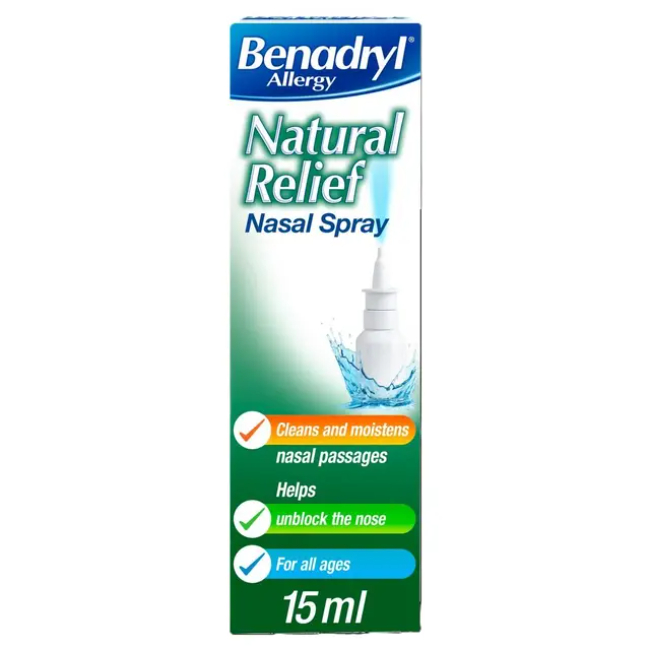 Benadryl Allergy Natural Relief Nasal Spray is a gentle, non-medicated treatment designed to relieve nasal symptoms associated with allergies, including congestion, a blocked or runny nose, and irritation. It works by cleansing the nasal passages and washing away allergens such as pollen, dust, and other irritants. The spray contains a preservative-free isotonic saline solution with mineral salts, which helps to moisturise dry nasal passages while supporting the nose’s natural cleansing function. This helps reduce irritation and restore comfort without the use of medicated ingredients. The spray formulation allows for targeted, easy application and can be used regularly throughout the day as needed. Suitable for adults and children (typically from 6 years and over), it is commonly used for hay fever, colds, sinus irritation, and general nasal dryness. Designed for frequent use, it provides natural relief while maintaining nasal hygiene. Please note that images are for reference only. We can not guarantee that the item received will mirror the brand shown in the image unless the brand name is specified in the product listing.