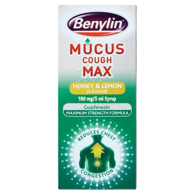 Benylin Mucus Cough Max Honey & Lemon Syrup is used for the relief of chesty (productive) coughs, helping to clear excess mucus from the chest and ease breathing discomfort. It works by thinning and loosening phlegm, making it easier to cough up and improving chest congestion. The liquid syrup formulation contains guaifenesin, an expectorant that helps break down mucus and support more effective coughing. The honey and lemon flavour provides a soothing effect on the throat while making it easier to take. The liquid format allows for easy dosing and is suitable for adults and adolescents aged 12 years and over. Designed for short-term use during chesty coughs associated with colds or respiratory infections, helping to restore comfort and clearer breathing. Please note that images are for reference only. We can not guarantee that the item received will mirror the brand shown in the image unless the brand name is specified in the product listing.